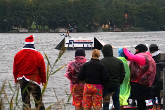 Im Regen zitternd warteten die 20 aktiven Wasserskisportler sowie gut 30 helfenden Unterstützerhände, mit Blick auf die gähnend leere Tribüne, am Pfingstsonntag auf den nahenden Showbeginn.