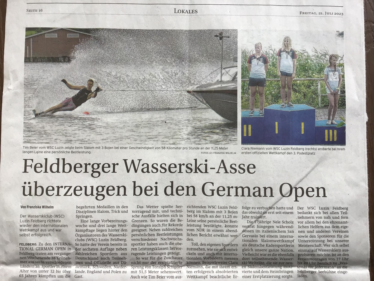Eine lange Vorbereitungswoche und drei lange Wettkampftage liegen hinter den Organisatoren des Wasserskiclubs (WSC) Luzin Feldberg. So hatte der Verein bereits in der sechsten Auflage neben zahlreichen Sportlern aus Deutschland auch Teilnehmer und Offizielle aus Dänemark, Schweden, Niederlande, England und Polen zu Gast.